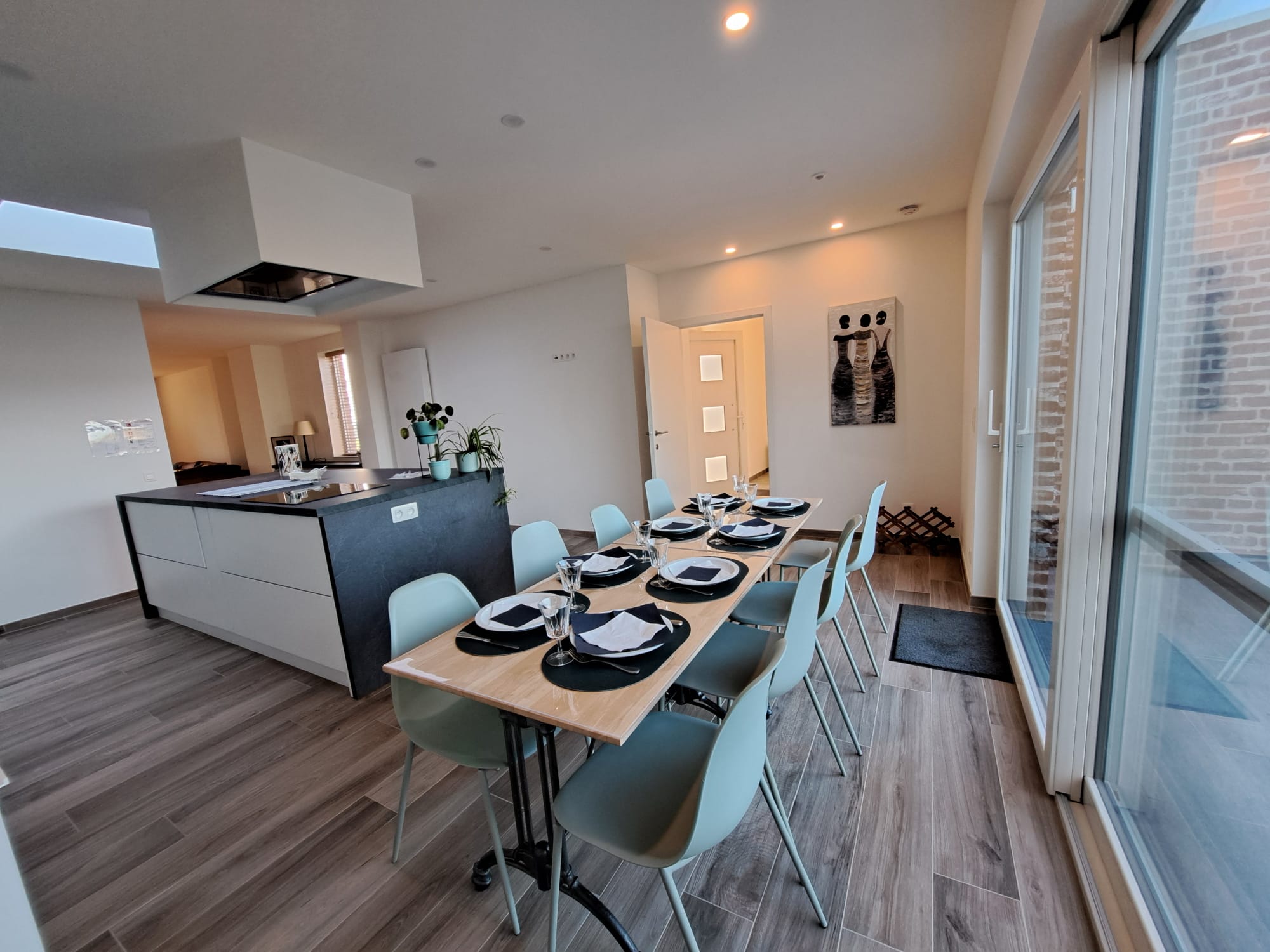 De volledig uitgeruste keuken omvat alle modern comfort en materiaal. Je krijgt er spontaan goesting om met z’n allen te kokerellen … of enkel te aperitieven.